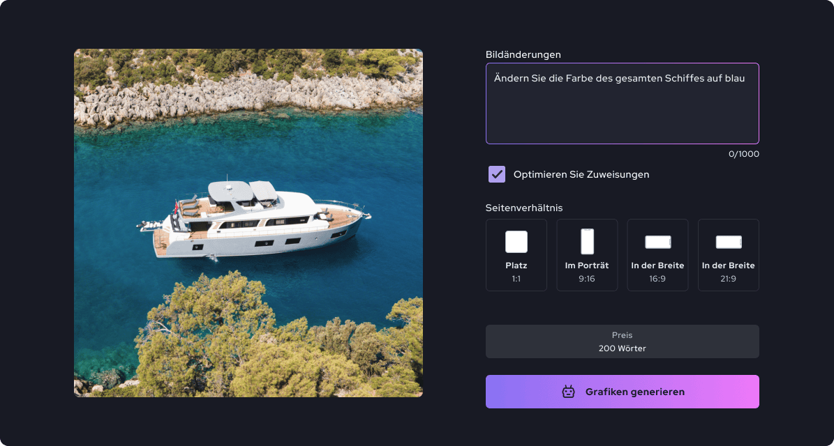 Beschreiben Sie einfach mit Worten, was Sie im Bild ändern möchten. Die KI findet automatisch das von Ihnen beschriebene Objekt und ändert es nach Ihren Vorstellungen - ob Sie die Farbe eines Autos ändern, den Hintergrund eines Fotos austauschen oder neue Elemente hinzufügen möchten.